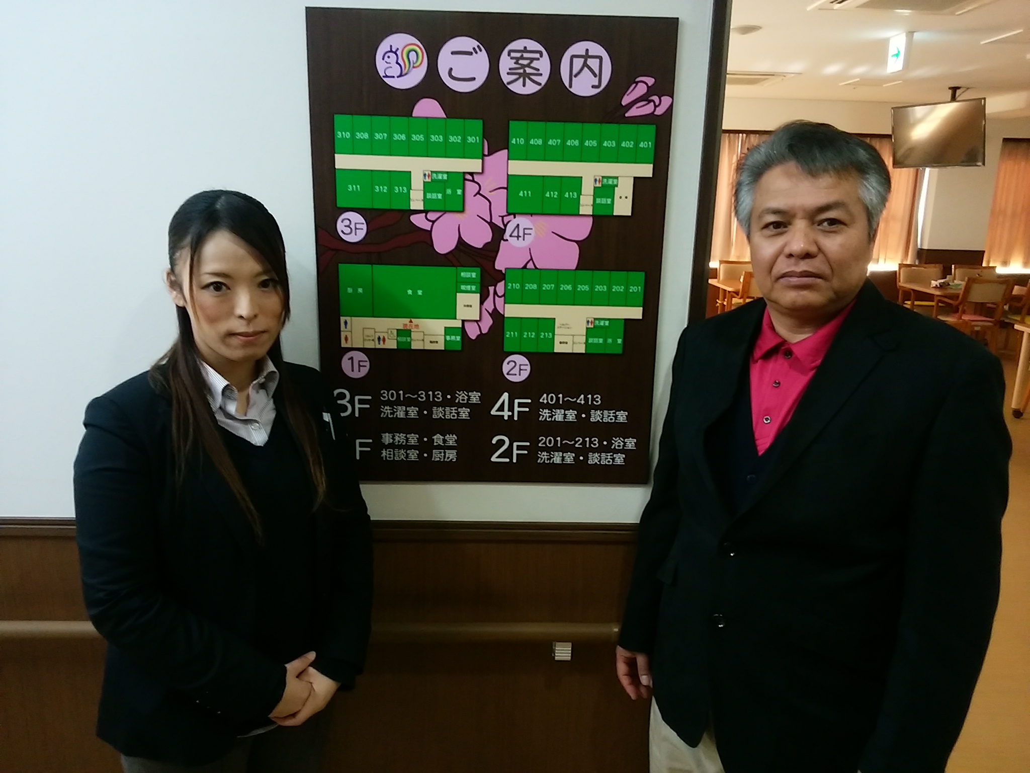 です❗ 玄関の写真は、こちらの岡本施設長と平野主任です。お二人とも明るく