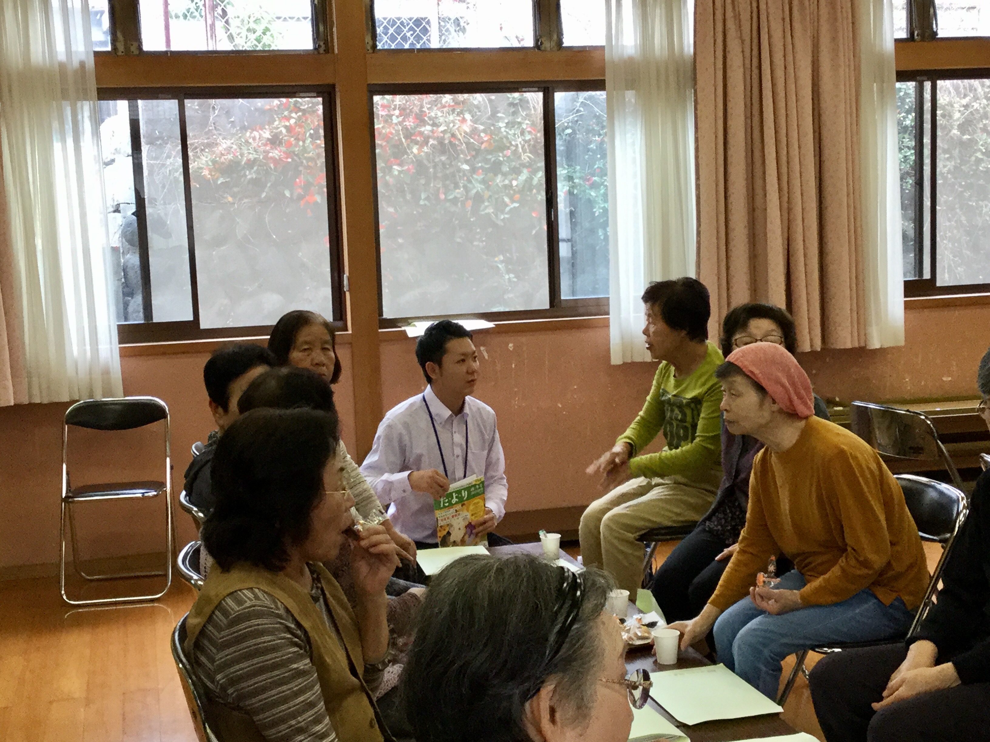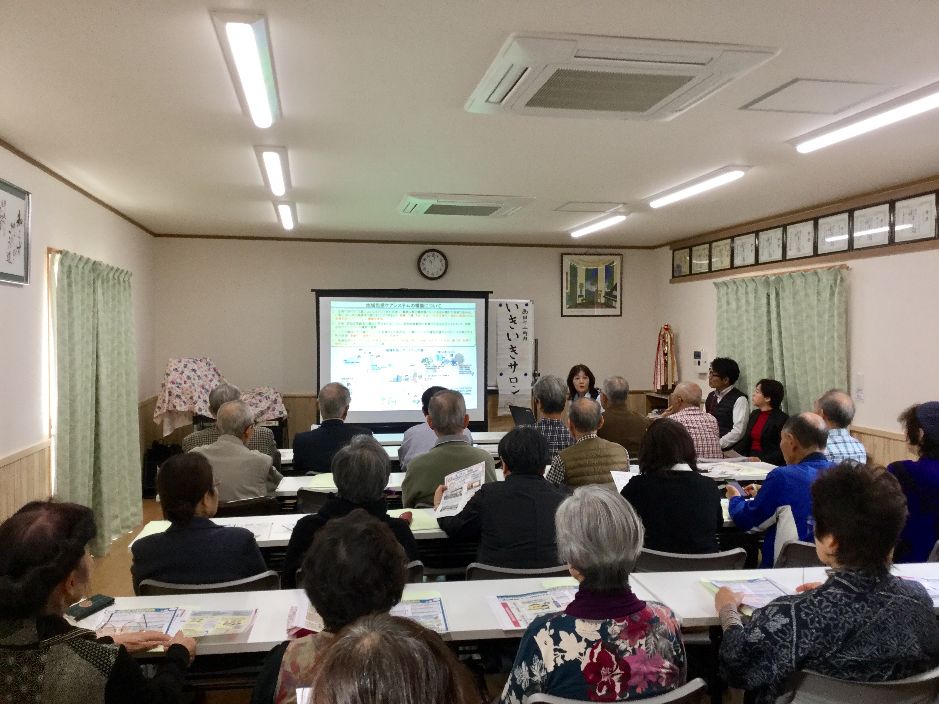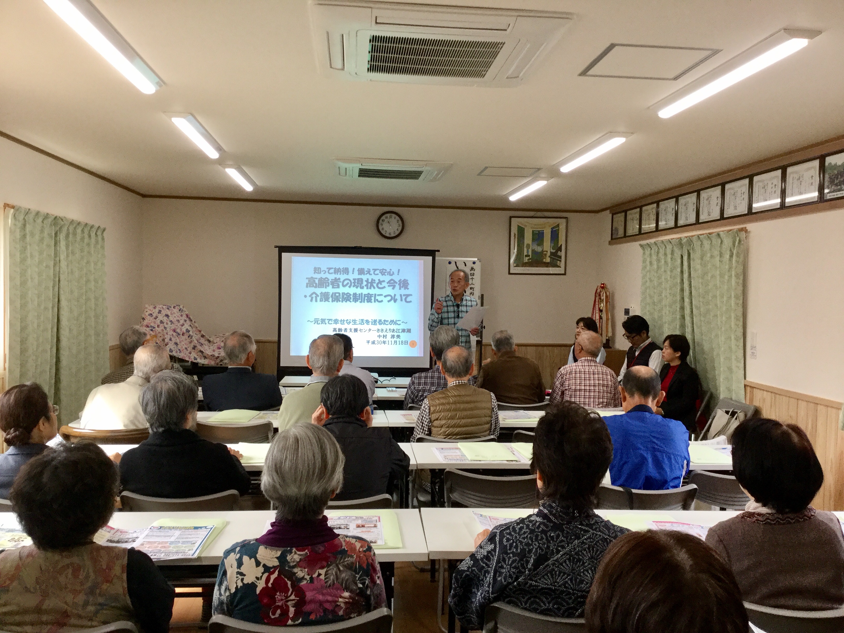続いて、ささえりあ江津湖の中村様による介護保険制度や地域包括支援システムについてのお話。私も知識が不足している部分があり、興味深く聞くことができました。その後、同じくささえりあ江津湖の木庭様が、ささえりあの役割についてご説明。質問の声も上がり、きちんと学ぼうとする姿勢が感じられました。