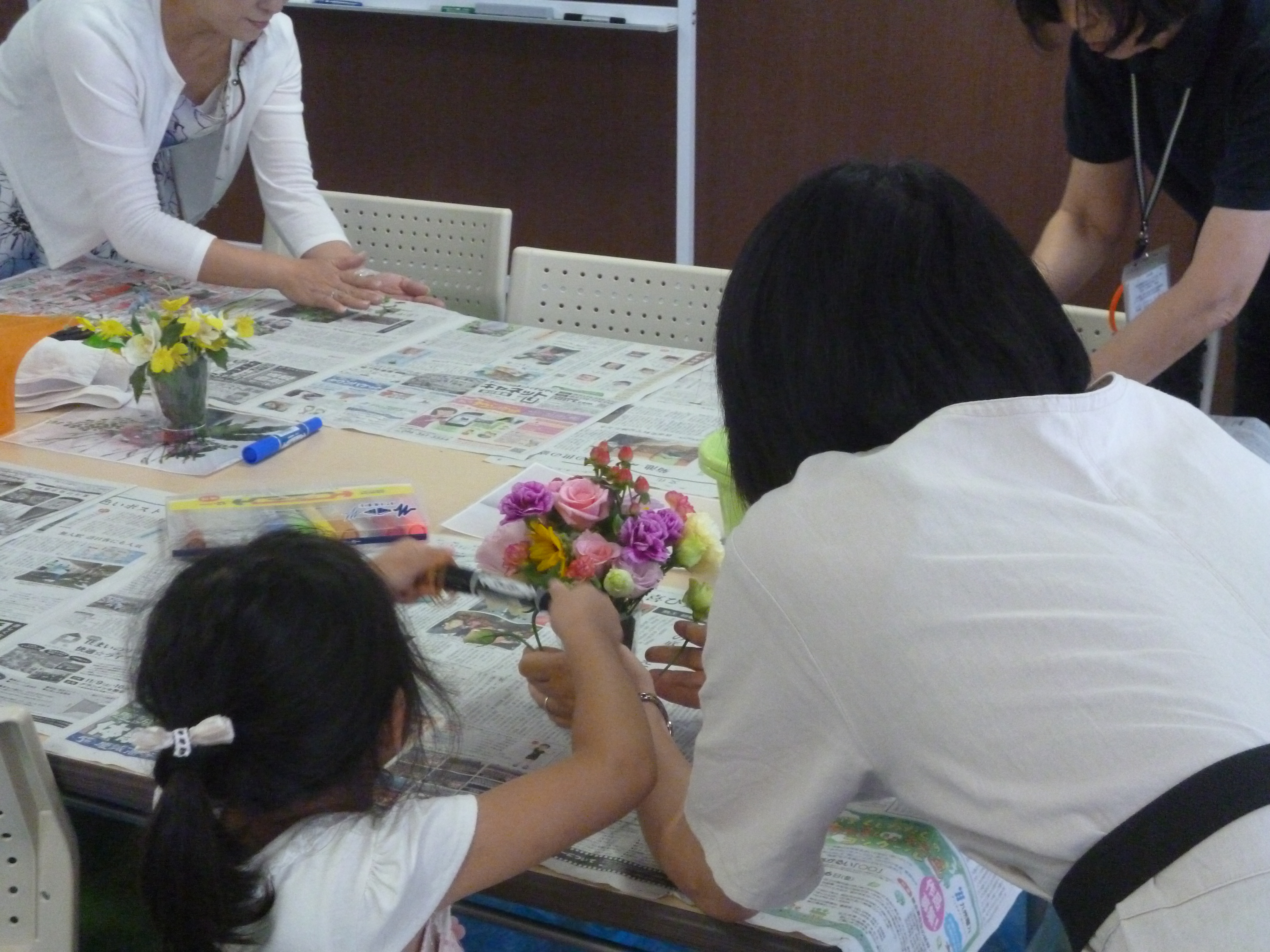 子どもは21人が参加し、まずは保護者と一緒にフラワーアレンジメントを行っていました。和気あいあいと作業している様子を見て、私もちょっとやってみたくなったり…(笑)。