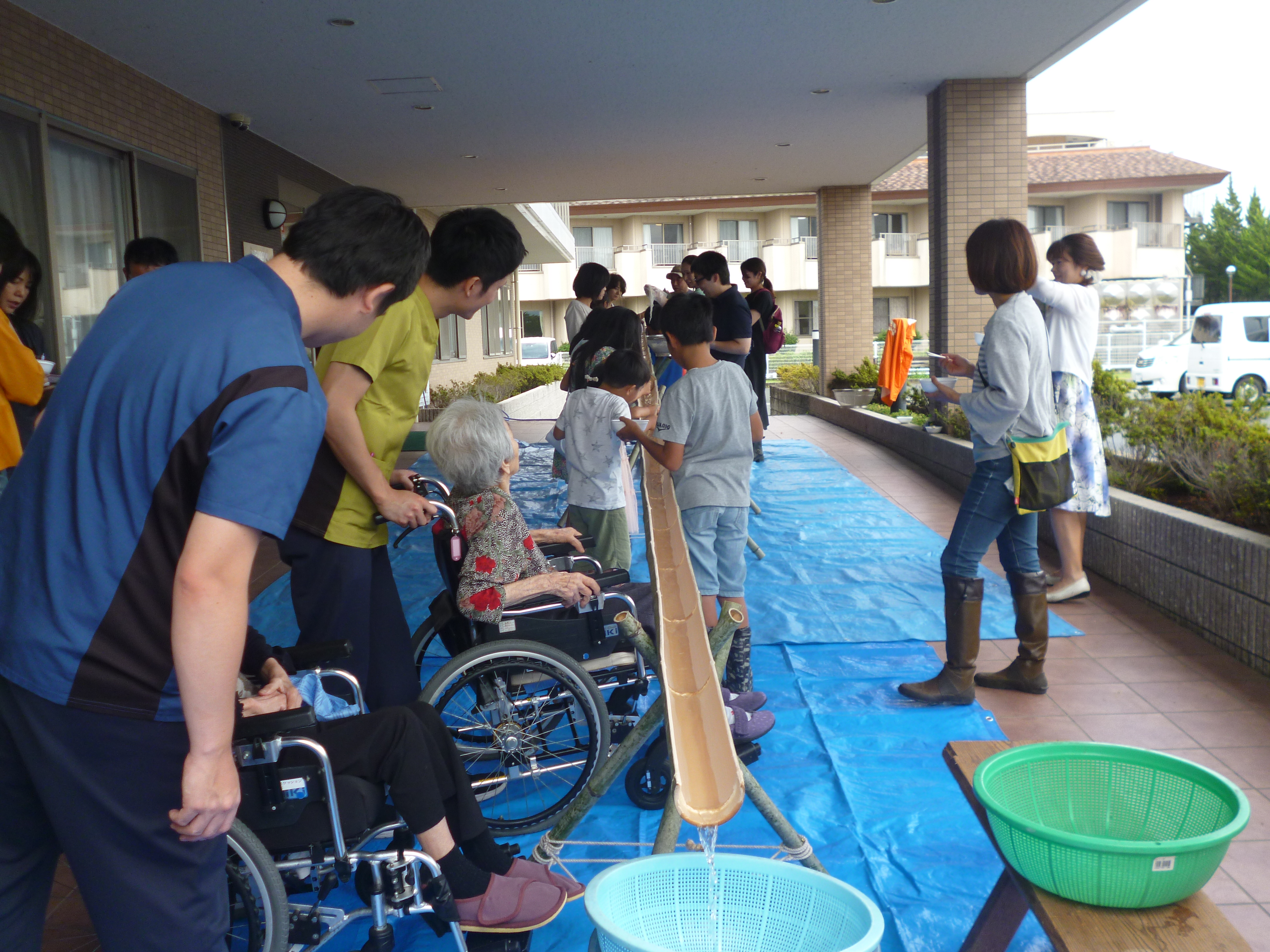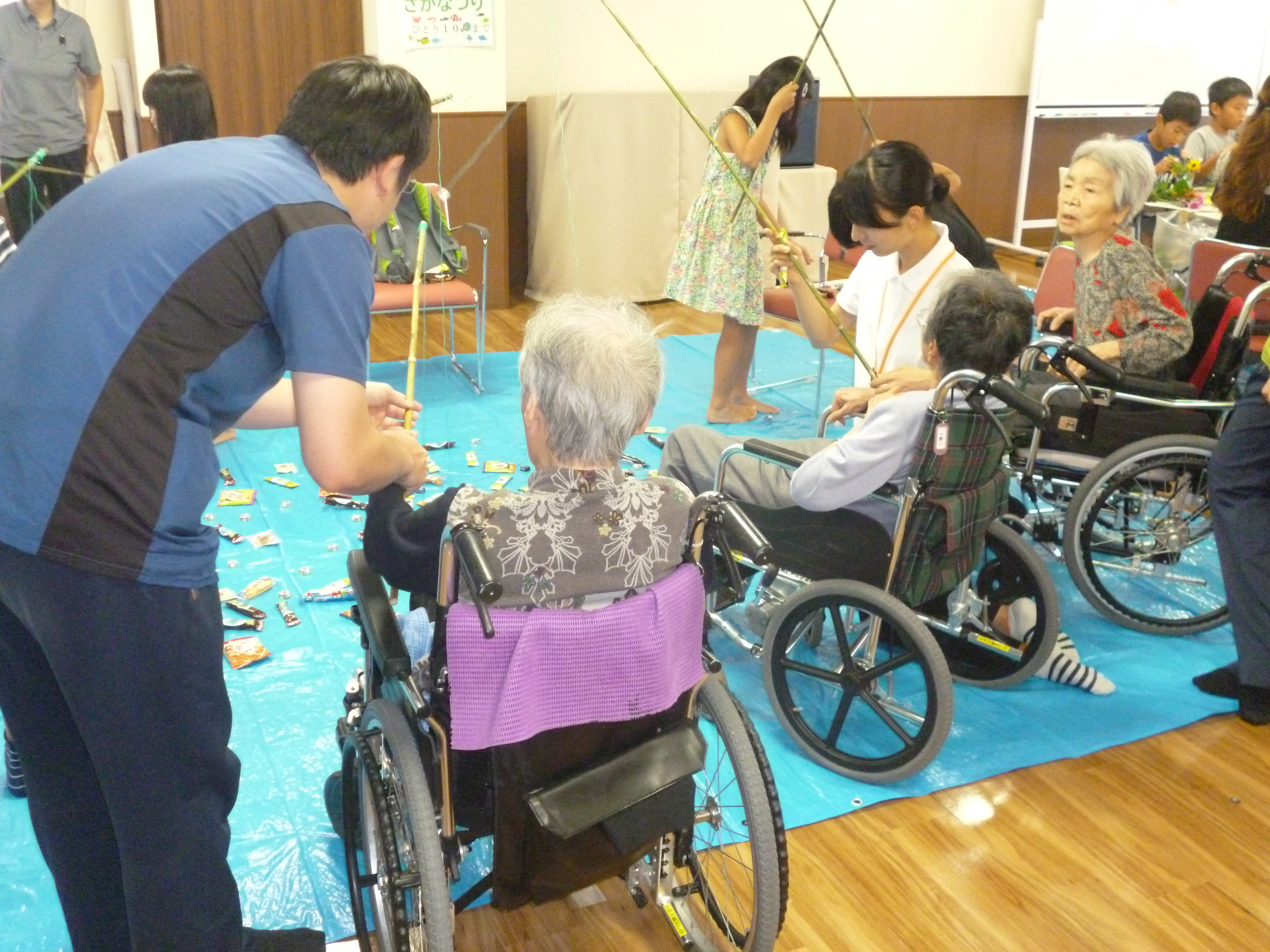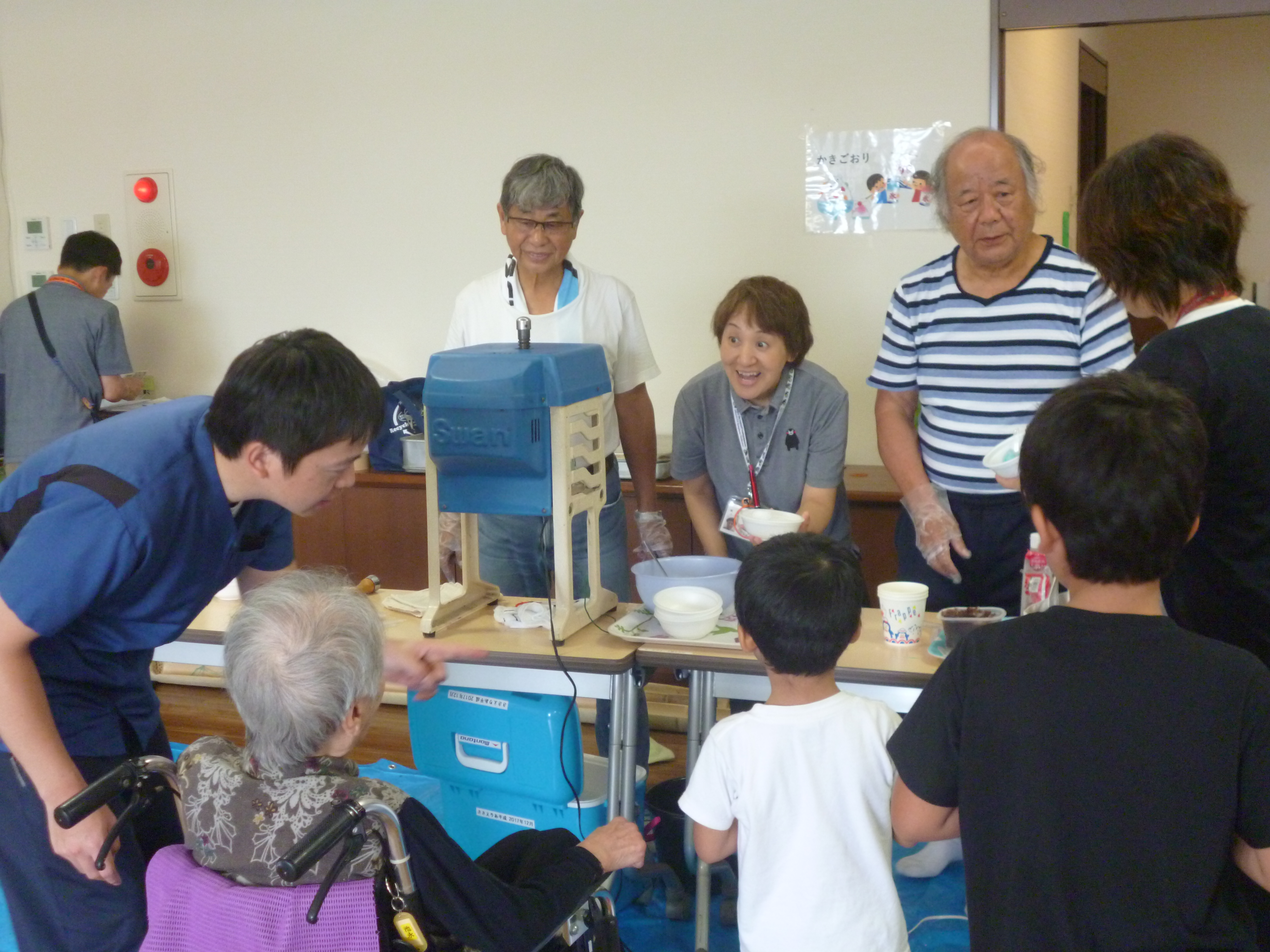 そのほか、地元の方が自宅に持っていたという、本格的なかき氷機を使ってフワフワに削られたかき氷や、ビニールシートの上にあるクリップのついた駄菓子を釣り糸の先に付いたマグネットで釣り上げるゲームがあり、みゆき園の入居者の皆さんも楽しんでしました。