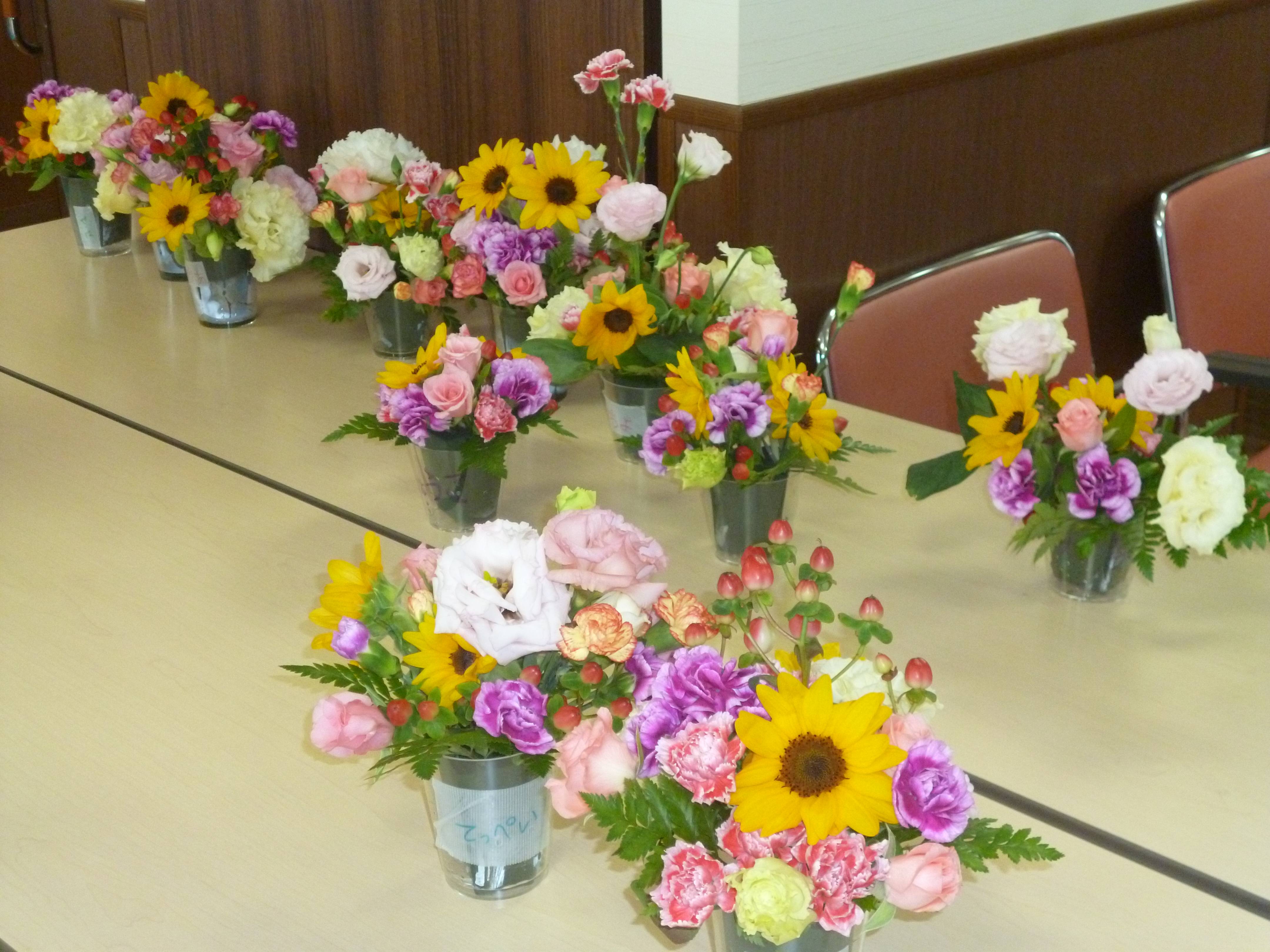 完成した作品が机の上に並べてありましたが、かわいらしい花がうまくまとめられているハイクオリティーなものばかりでびっくり!小さいひまわりがアクセントになって素敵ですね。