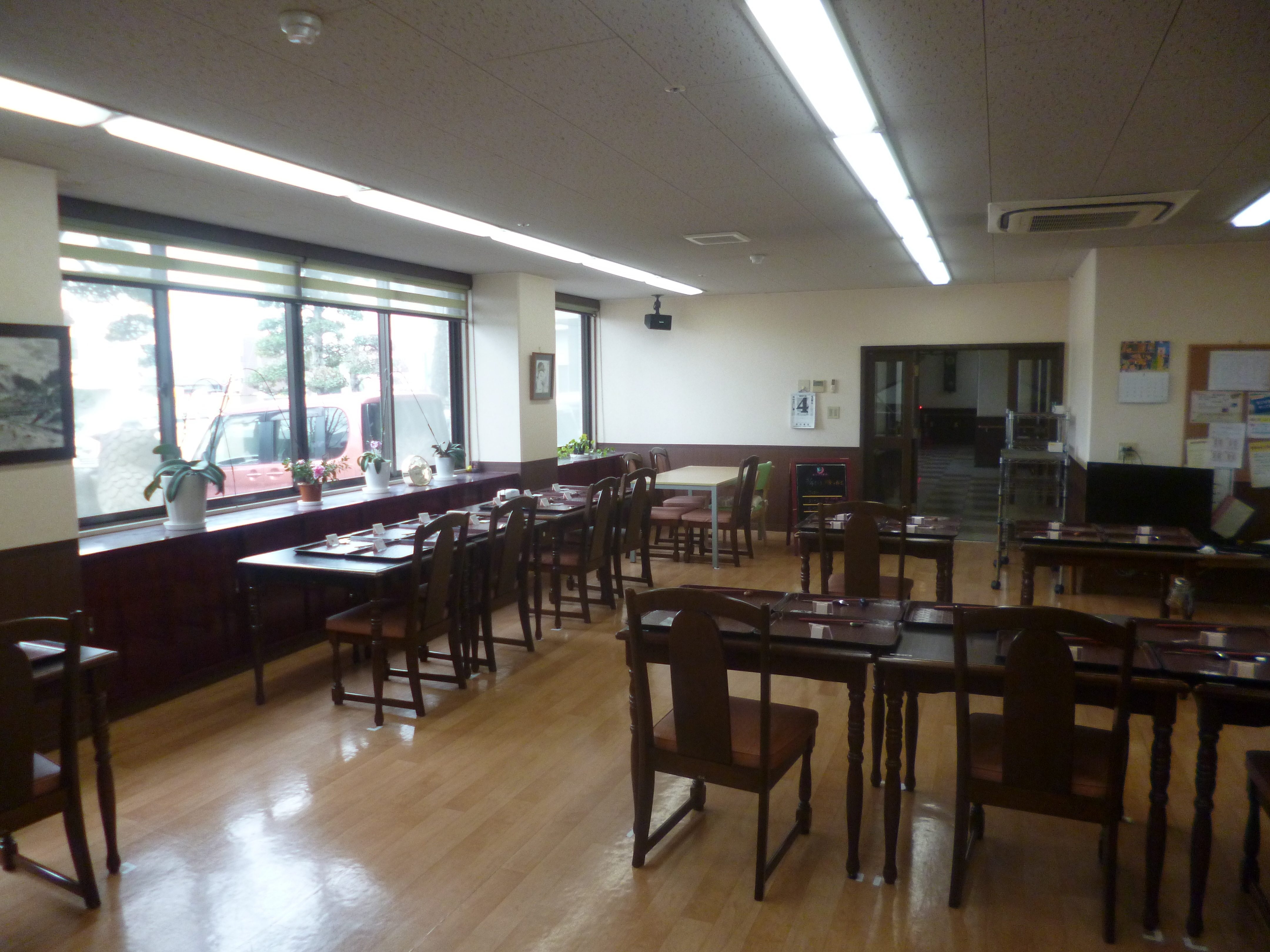 1階にある食堂は、レトロな洋食レストランのような雰囲気。机や椅子のデザイン、風合いが素敵です。入り口の看板にメニューが手書きされているのもレストランっぽくていいなと思いました。