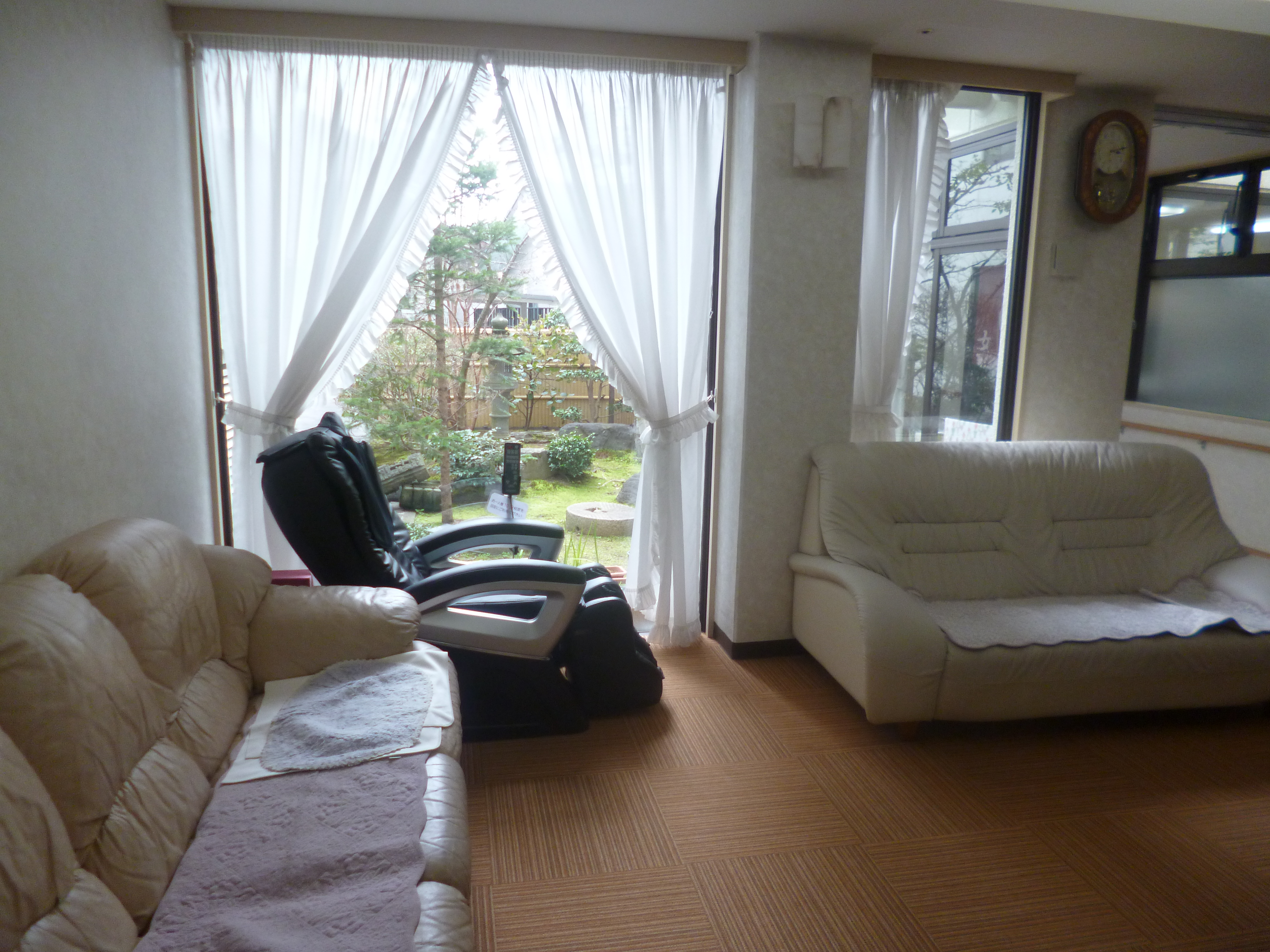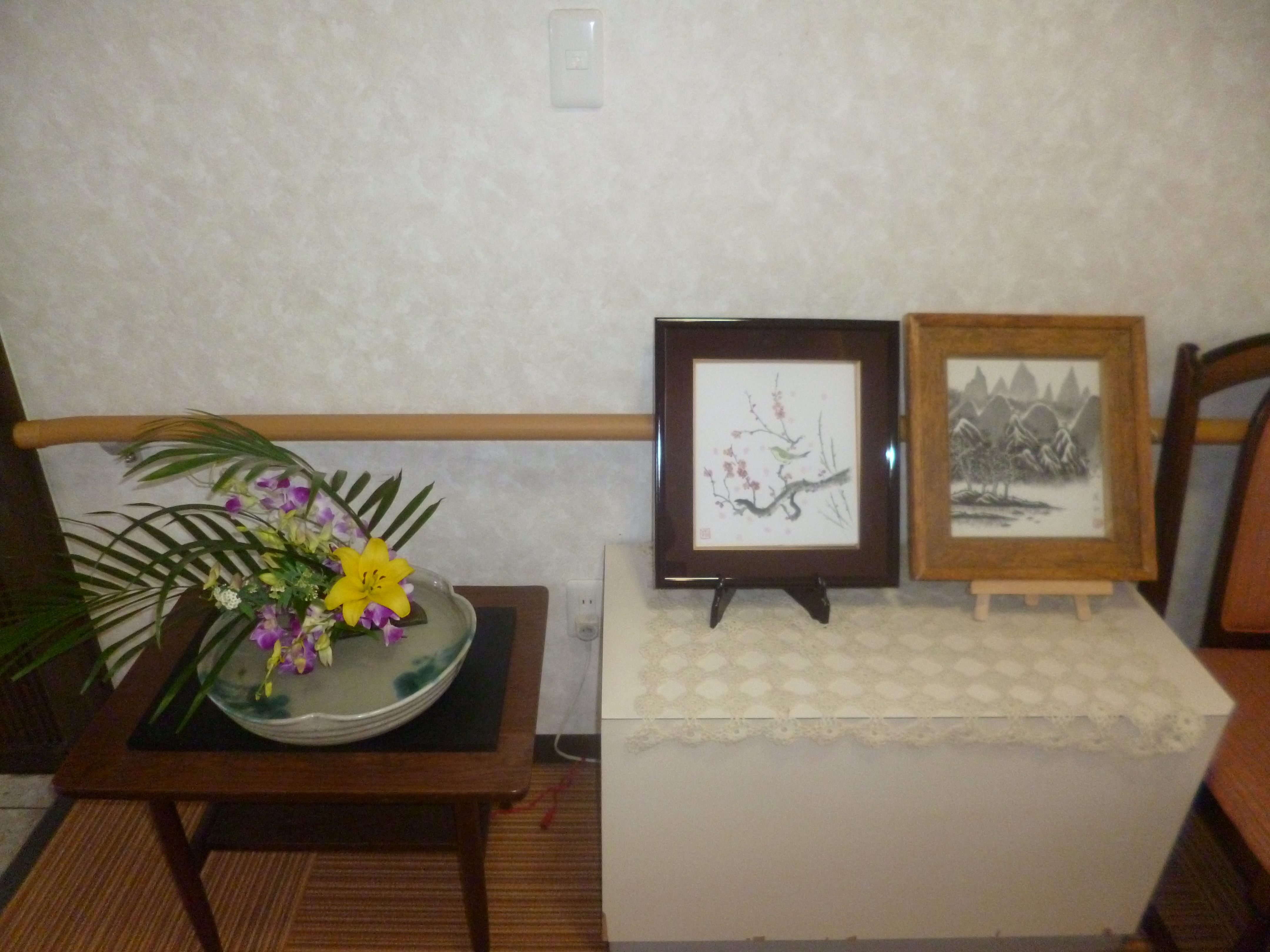 お風呂へ行く途中にある休憩スペースには、座り心地抜群のソファーとマッサージチェアが設置されています。そばには利用者様による絵画や生け花が飾ってあり、リラックスしながら観賞できます。