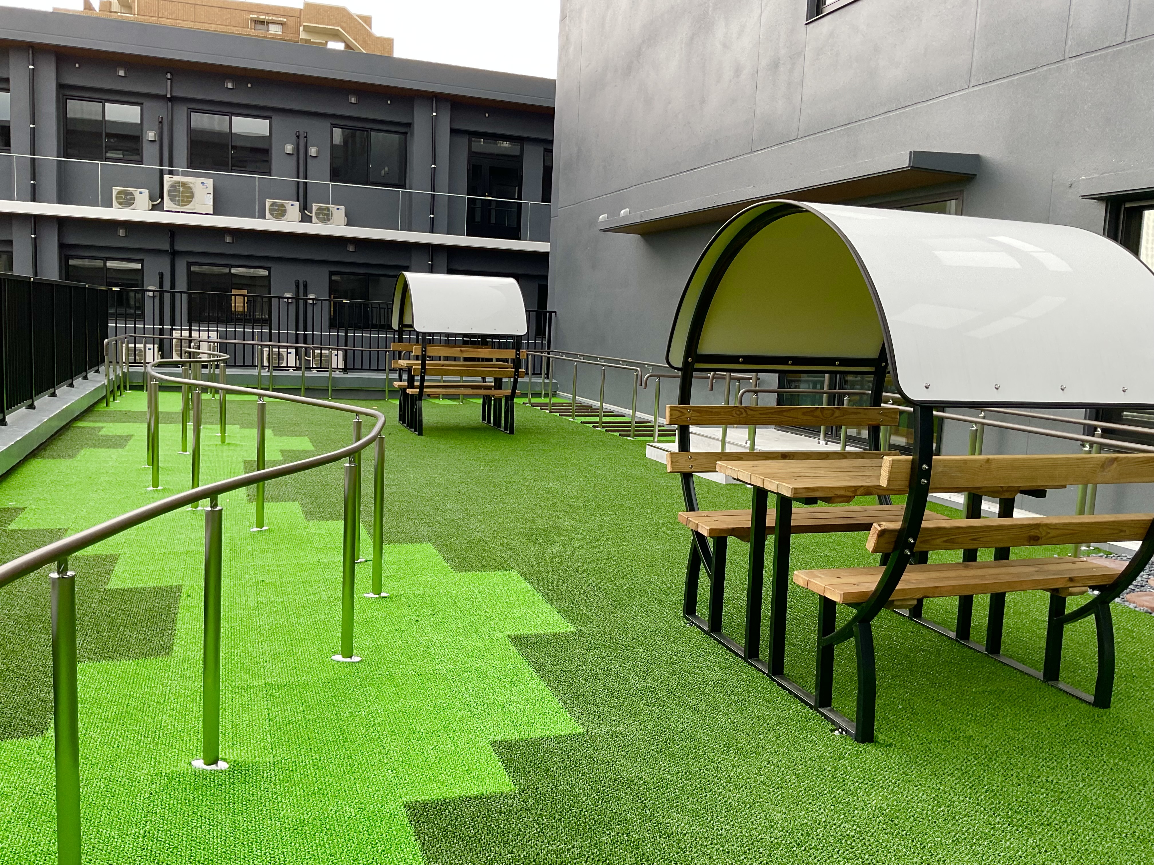 次の写真はリハビリガーデンです。リハビリの専門職(理学療法士、作業療法士)によるリハビリ指導を受ける事ができます。お天気の良い日は気持ちよさそうですね☀️