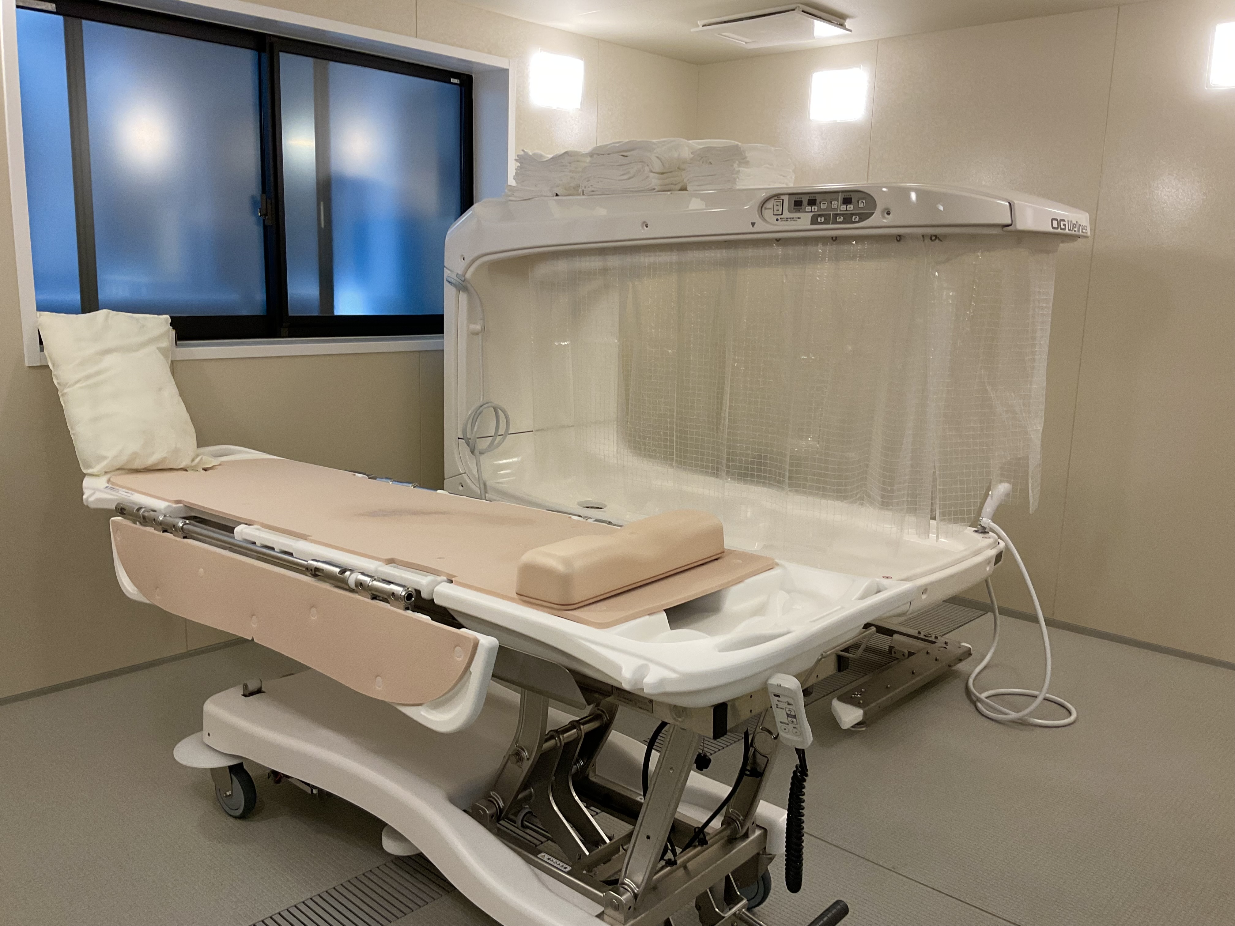 次の写真は寝たきりの方でもご利用できるミスト浴が導入されています。身体への負担が少なく安全な入浴が可能です。