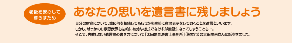そこで、失敗しない遺言書の書き方について「太田黒司法書士事務所」(熊本市)の太田黒崇さんに話を聞きました。
