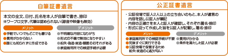 遺言書を作成する方法はいくつかありますが、「自筆証書遺言」と「公正証書遺言」が一般的。法的に有効な遺言にするためには、定められた書き方を守ることが重要なので、司法書士などの専門家に相談すると安心です。