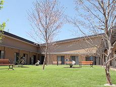 ▲ 美しい芝生と木々が植えられた中庭。庭の散歩が利用者の楽しみに