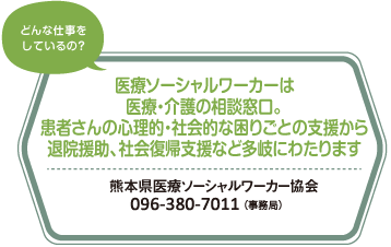 医療現場の総合相談窓口として、人と病院をつなぐ役割を担うソーシャルワーカー。現在、熊本県医療ソーシャルワーカー協会に所属する会員数は約350名で、医療介護の現場だけでなく、精神保健福祉分野や障がい福祉、地域包括支援センター、教育機関など活躍の場は多岐にわたります。