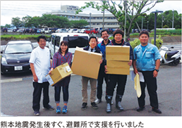 熊本地震の際は、地震発生後3日目には南阿蘇や益城の避難所で、おむつや口腔ケア用品などの支援物資を配布。各避難所を見て回り、ポータブルトイレや手すり、スロープ、シャワー時のイスなど何が必要なのかを見極めた上で、設置に取り組みました。