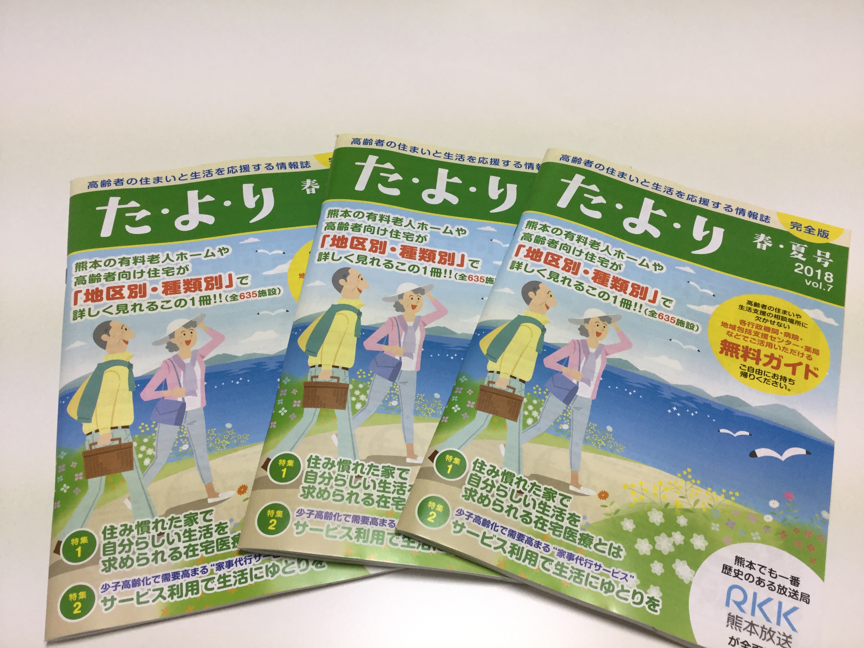 高齢者の住まいと生活を応援する情報誌『た・よ・り春夏号』いよいよ本日発行です!! 各行政機関、病院、地域包括支援センター、薬局など県内約1200ヶ所に無料配布・設置しております。 今回7号目となりますが、新規オープン施設の情報や生活支援の情報が増え、内容が盛りだくさんになっております。 ぜひお手に取ってご覧ください!