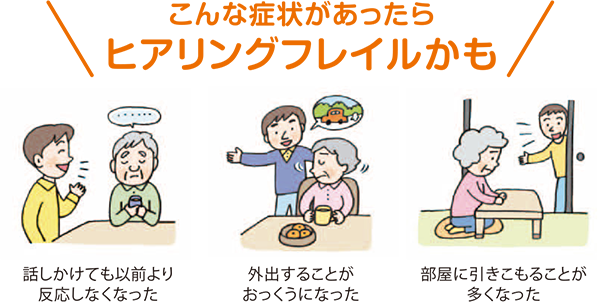 加齢による聴力の衰えはいたしかたないものです。しかし、本人あるいは周りの人がより早く気づいて対処していけば、ヒアリングフレイルは予防でき、あるいは生活の質を落とさずに済むのです。しかし、高齢者の中には耳が聞こえにくくなると、そのことを相手に伝えなかったり、あるいは隠したりして、自ら人との会話を避ける傾向にあります。もし①最近話しかけても反応が少なくなった②テレビを見なくなった③家族との会話を避け、部屋にこもりがちになった④外出するのをいやがるようになった、などの状態が続いたら、ヒアリングフレイルを疑ってみてください。年だからしょうがないとあきらめるのではなく、耳鼻科での治療や補聴器、対話支援機器を使用するなど適切な対応をとってあげてください。本人とのコミュニケーションが取れるようになり、何よりも、本人が聞こえる、思いが伝わる、という人とつながる喜びを取り戻せると思います。