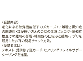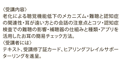 私が活動している『NPO法人日本ユニバーサル・サウンドデザイン協会』では、ヒアリングフレイルサポーター養成講座をオンラインで開催しています。高齢で聞こえにくくなった人や聴覚障害がある人との音声による対話を行う場合の「聴覚の基礎知識」と「対話支援技術」を学び、支援機器も活用しながら安心して対話できるための講座です。会話が難しくなったご両親のために参加される方、あるいは高齢者をサポートするケアマネジャー、看護師、介護職の方など多くの方が受講されています。家族や周りの方がヒアリングフレイルをより理解し、みんなで支えていくことが必要です。