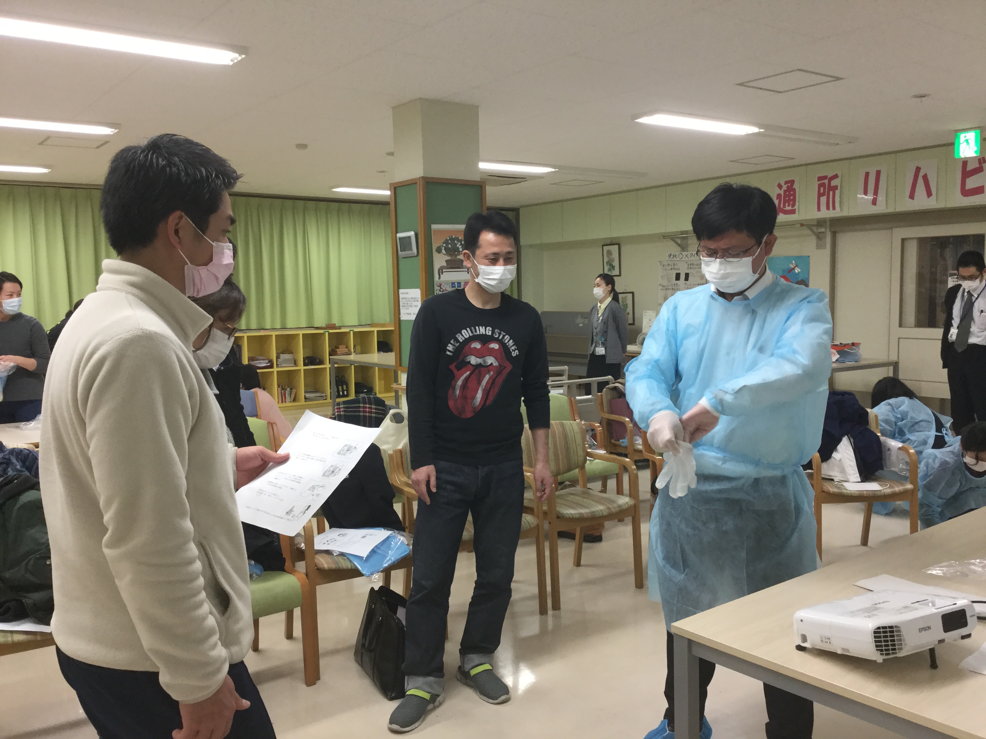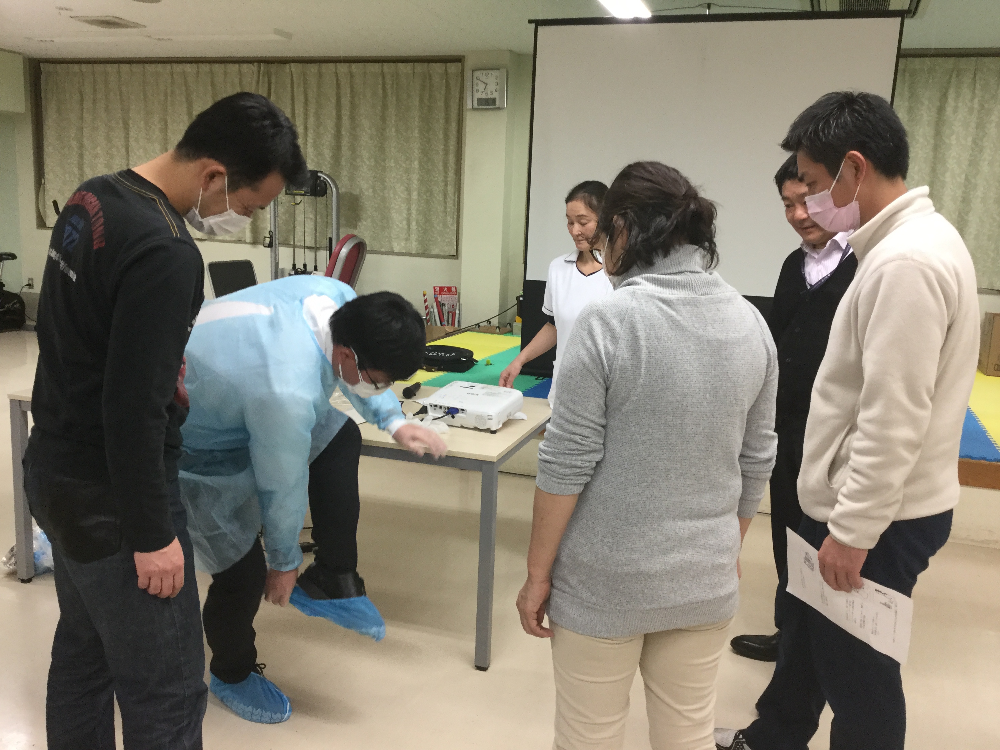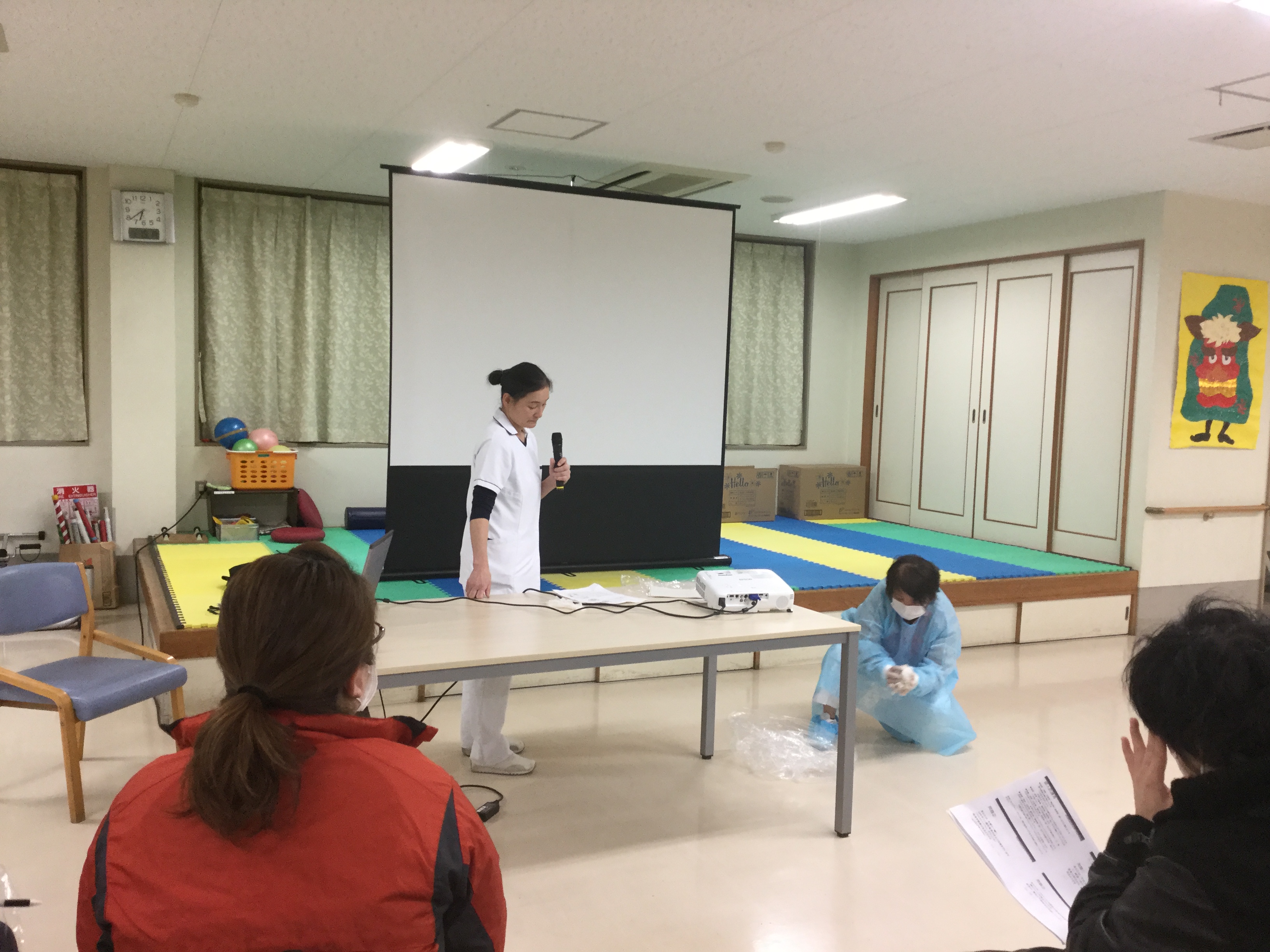 講義の後は、参加者の皆さんで、個人防護具の着用をし、吐物の処理をするまでを
