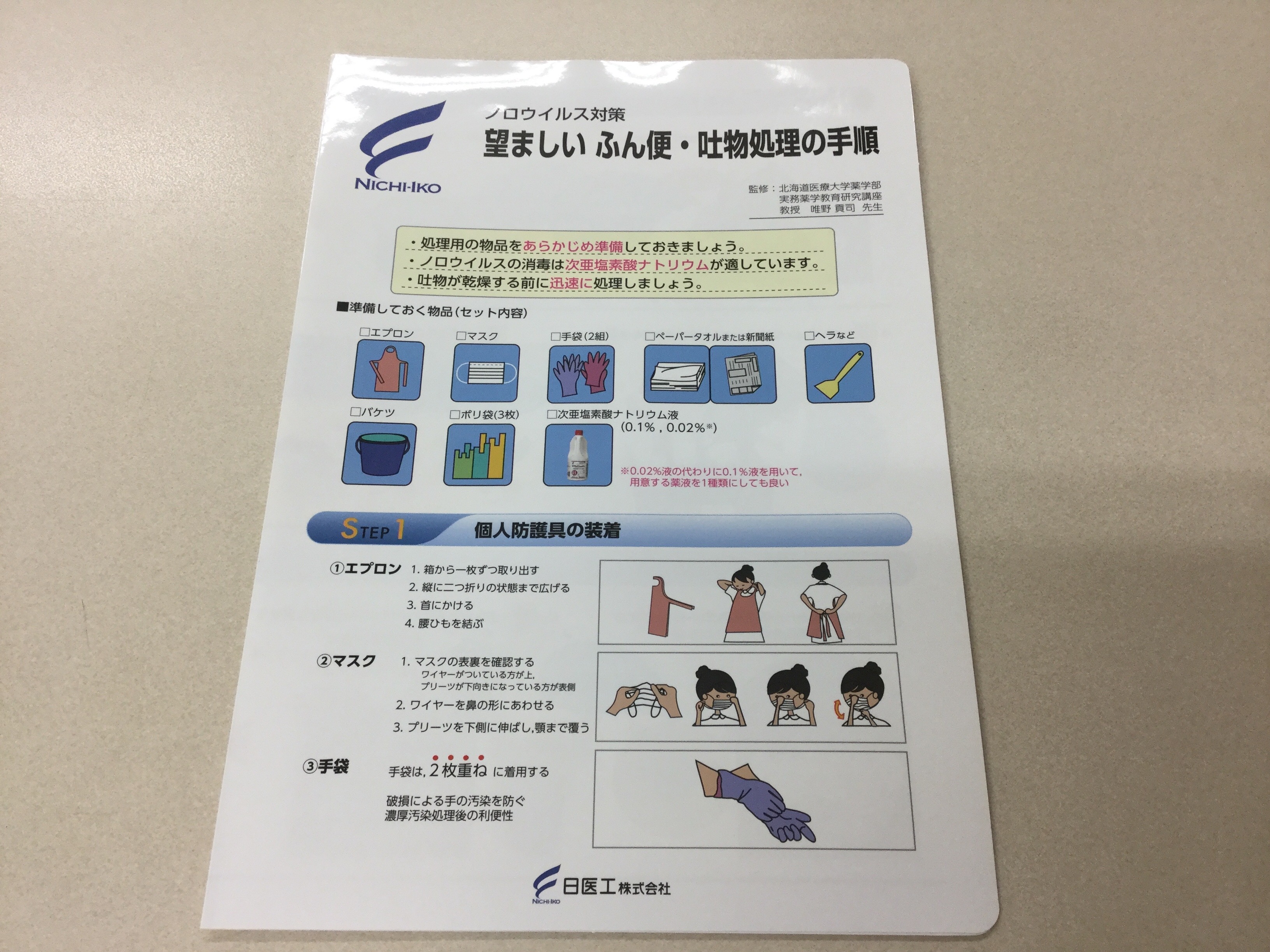 まず、手指衛生の指導があり、個人防護具の着脱手順、吐物の処理の仕方に